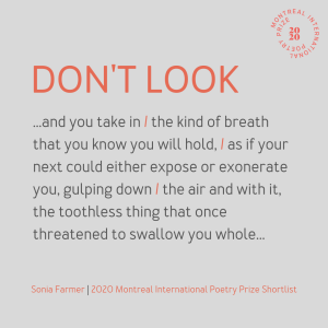 Sonia’s poem, “Don’t Look”, was selected as one of 54 shortlisted poems for the 2020 Montreal International Poetry Prize, a contest that challenges poets from around the world to submit a poem of 40 lines or fewer for a winning prize of $20,000 CAD.